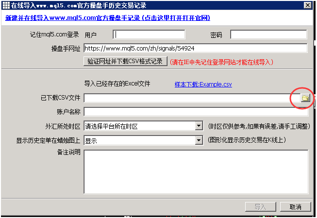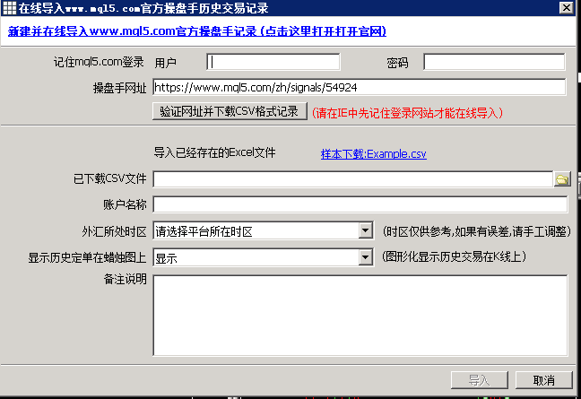 https://www.mql5.com/zh/signals/mt4 这里有来自全球的顶尖交易高手,记录都可以导入.目前仅支持MT4类型的高手.以上的用户名和密码,是https://www.mql5.com/ 上面免费注册的.请在注册后输入在复盘软件中.如果无法验证成功.就请手工下载该交易者的记录.再人工导入:先选择网站中的"交易历史记录"再找到右下角的导出.再选择刚刚下载的文件,人工导入