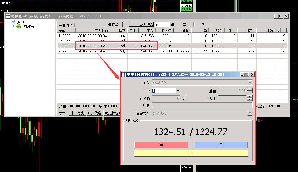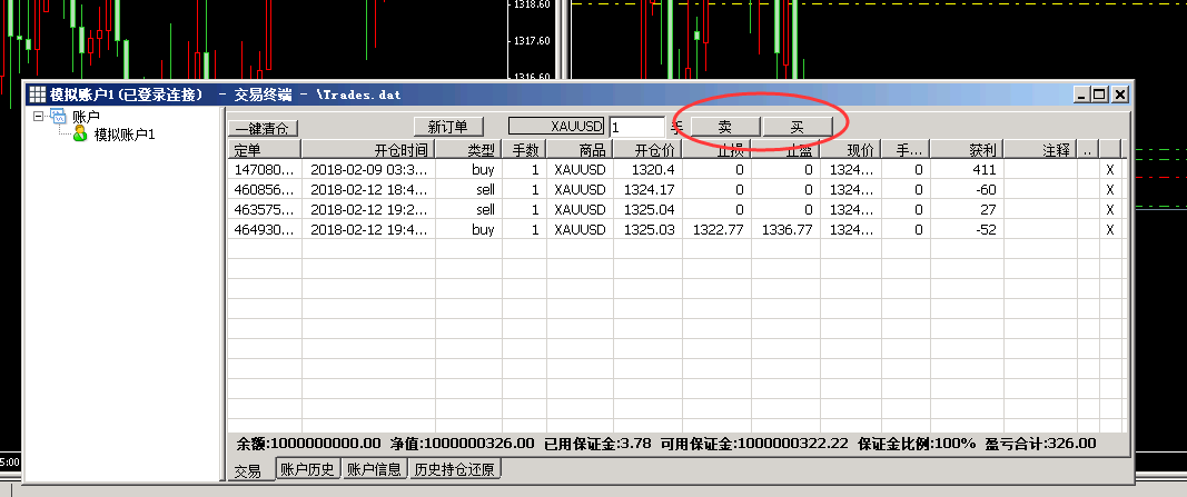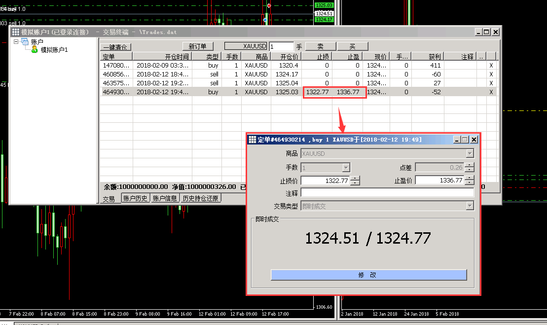 也可以采用拖动订单水平虚线来止损止盈.参考章节"鼠标拖动止损止盈"