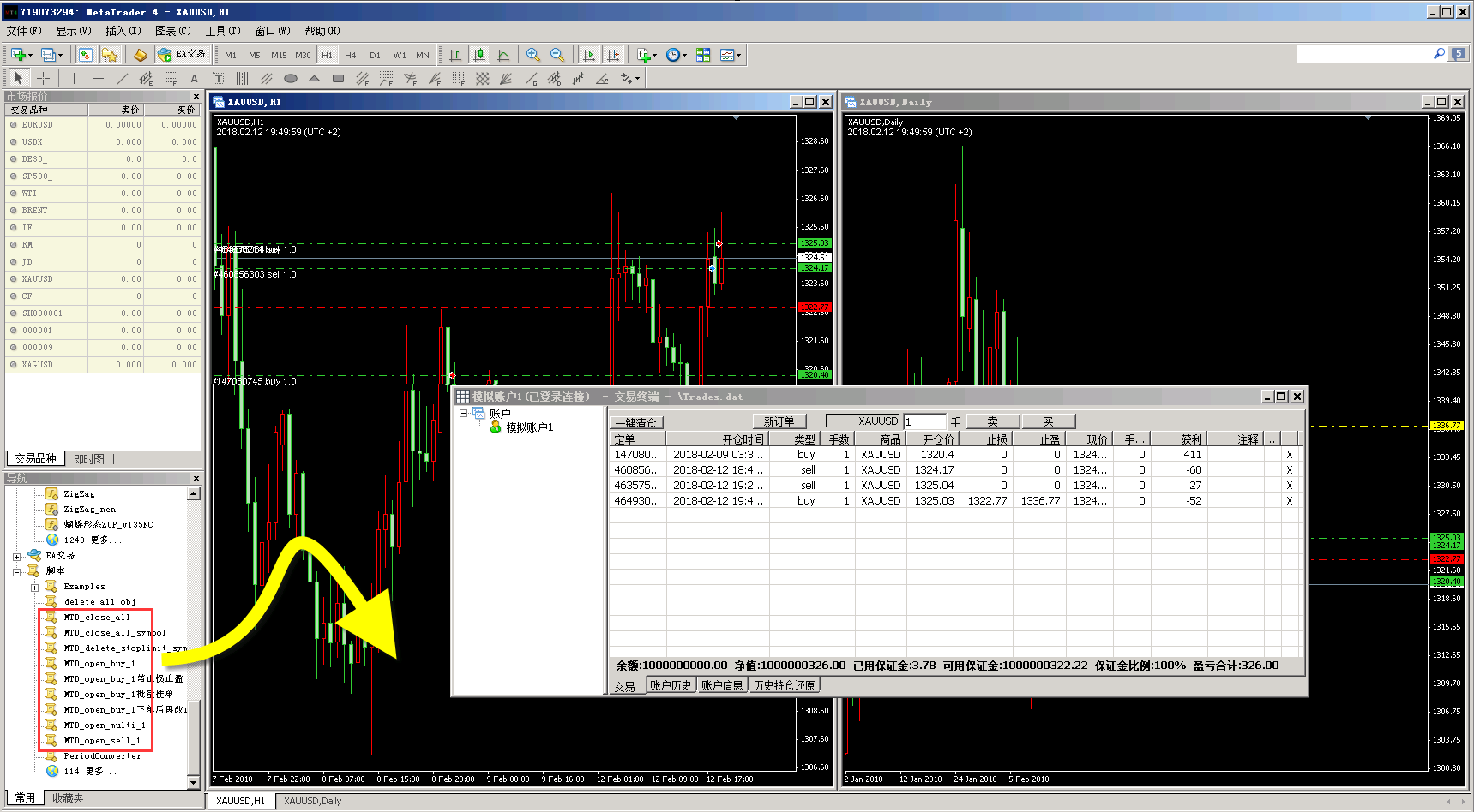 方法3:脚本下单,双击某个脚本或者拖拽到窗口.脚本包含了开仓,平仓,修改止损等各种复杂和灵活的控制,可以大家编写各种脚本,参考EA章节