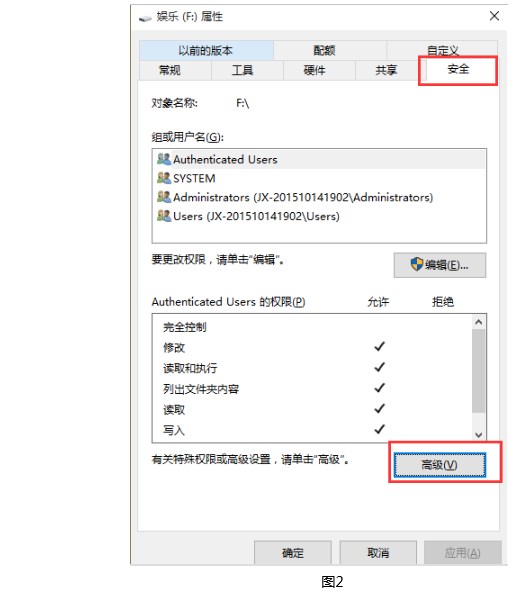 2、在“属性”菜单中选择“安全”并点击下面的“高级”。如图2所示