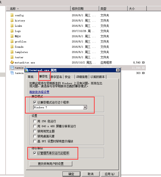 修改文件D:\复盘软件\MT4\terminal.exe的兼容性.