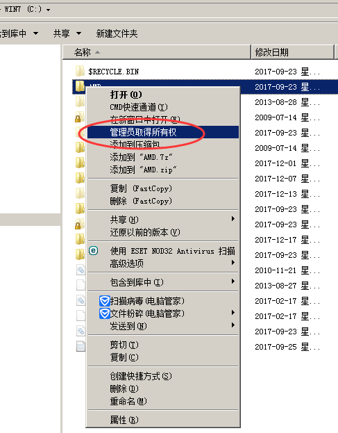 把以上保存到文件 "管理员取得所有权.reg"文件中后,双击执行即可,然后在目录里面右键,就可以看见一个选项"管理员取得所有权"