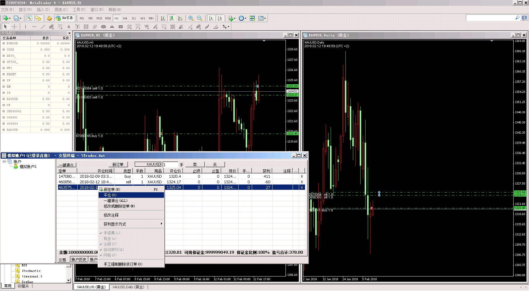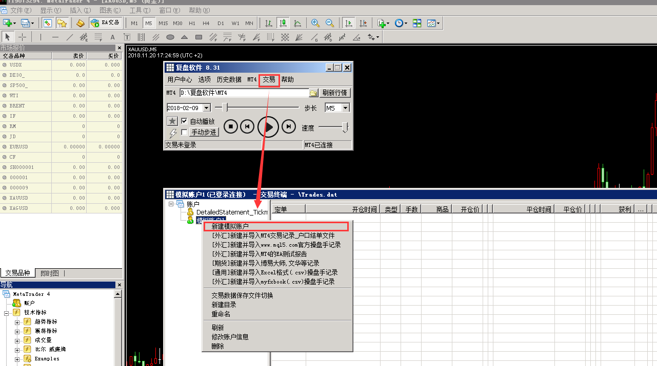 完全模拟真实环境中的交易.让你用模拟资金体验最真实交易,训练你的盘感和交易系统. 使用方法:在系统菜单中选择"交易",并选择登陆交易.就可以看到如下主界面. 你可以在左边的账户列表中右键,创建一个模拟账户.如下图 开始一个订单 在MT4中会自动显示已经开单的记录(绿色虚线为开仓价),同时显示止损,止盈(红色虚线).