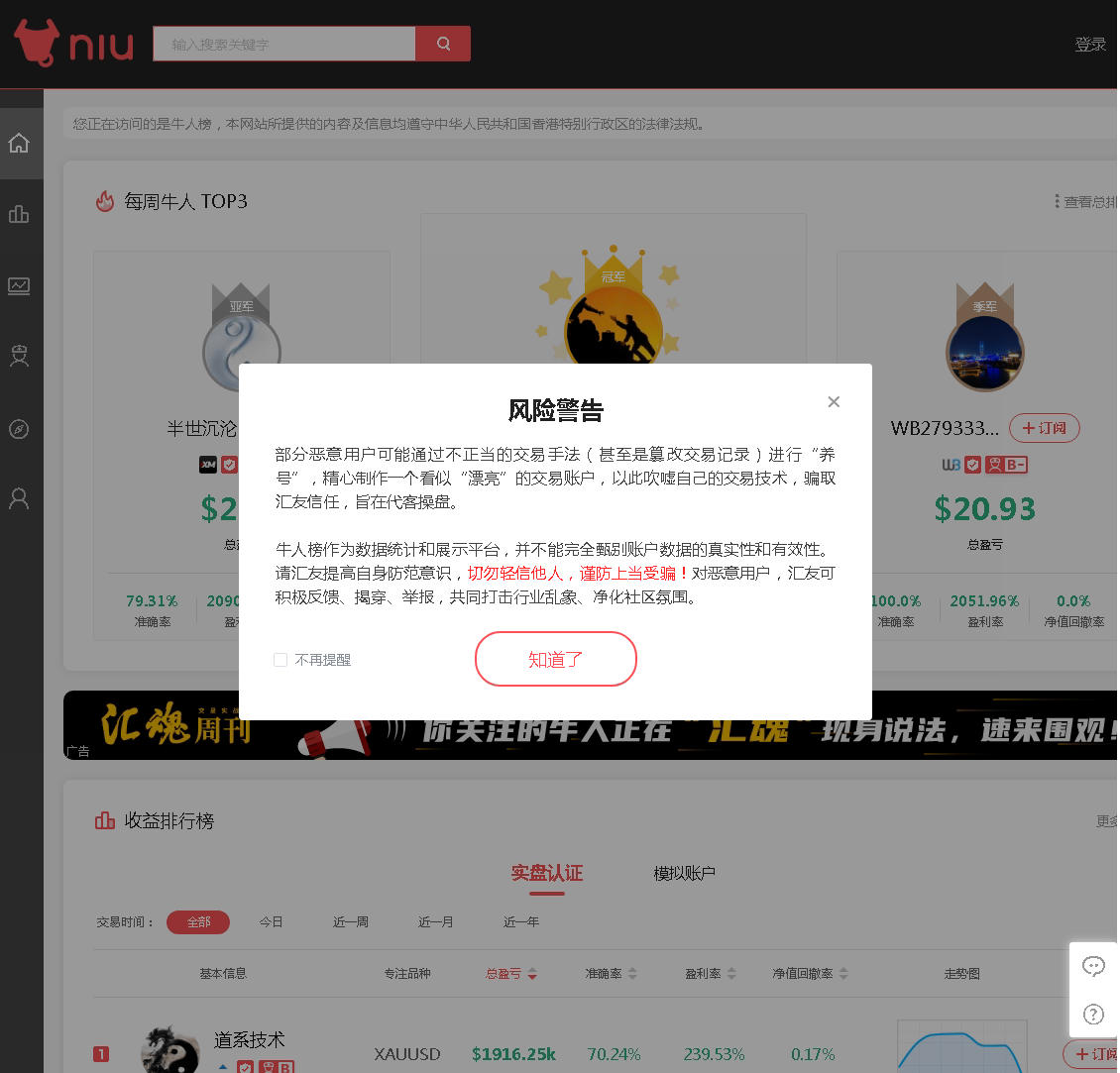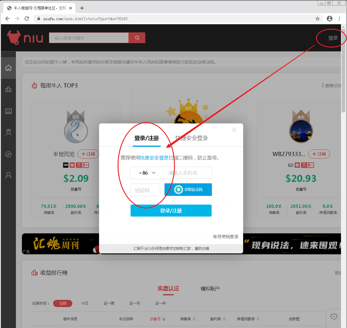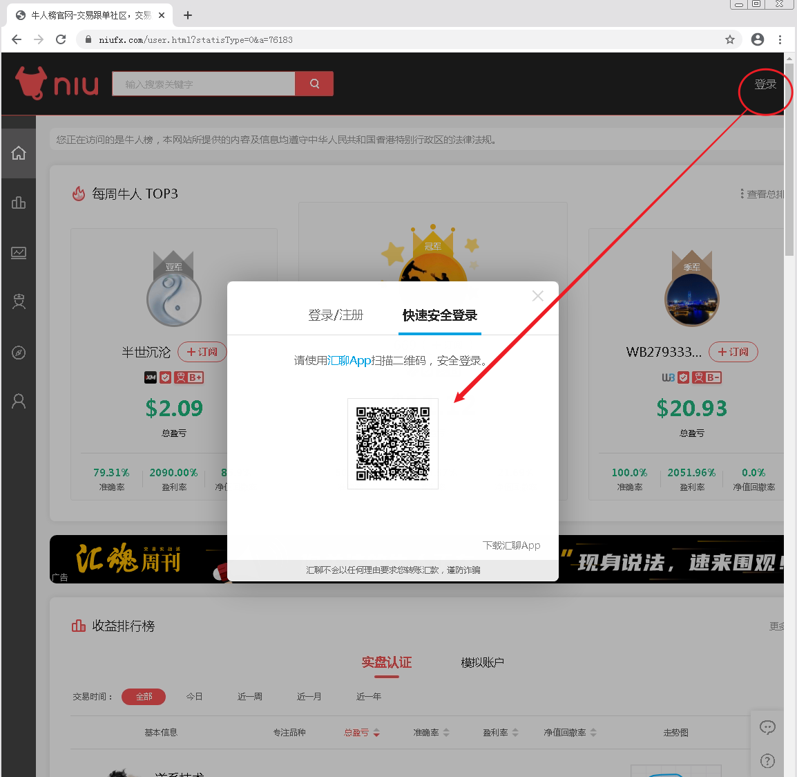 导入FX110牛人榜niufx.com操盘手记录如果本功能无法正常使用.可尝试本地安装一个谷歌Google的chrome浏览器,这样就可以正常了.官方网址: https://www.niufx.com/此处记得需要登录,不登录是无法下载操盘手交易记录的.可以使用手机客户端的汇聊app扫描,快递登录.也可以用手机验证登录: