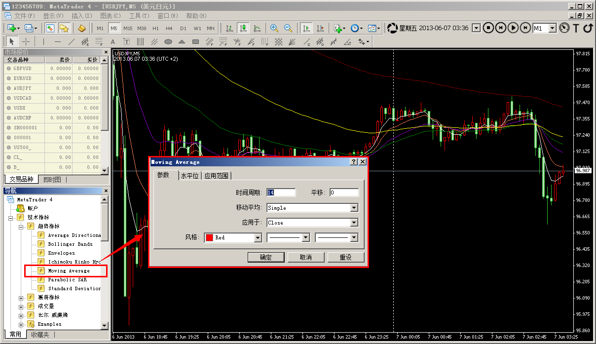 MT4中默认提供了各种均线.同时也可以自己编写均线指标.在自定义指标中,提供了一个参考的EMA指标如下:如果不想自己编写均线,可以直接使用MT4的均线.在技术指标中找到"Moving Average"即可.可以设置各种均线周期,颜色,线条等.同时还支持EMA等各种均线.