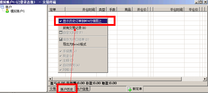 还可以在交易终端的"账户历史"中,鼠标右键,在弹出的菜单中在第一个位置设置显示与否