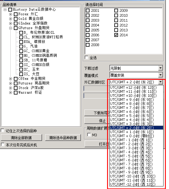 "外汇/黄金白银"以及外盘历史数据默认时区:东2区也可以切换数据所属的时区,只需在下拉框中选好,然后重新下载数据即可.推荐大家使用默认的东2区数据,这个时区附近汇集了全球主要的外汇交易所.是最理想的时区和使用人数最多的时区.数据采用IC的高质量数据.每日更新.IC的默认冬令时时间为东2区,跟中国北京时间(东8区)对比,慢6小时.同时在时区换算的时候,要注意夏令时,因为IC有采用夏令时,时间会快1小时,而北京没有采用夏令时制,所以夏令时IC比北京时间是慢5小时.