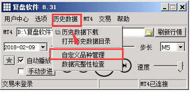 第一步:在复盘软件中的"历史数据"下拉菜单中选择"自定义品种管理",添加商品期货的品种RM1509