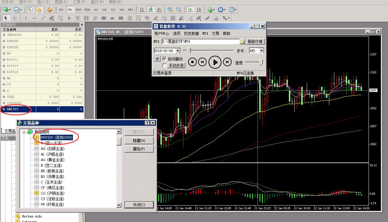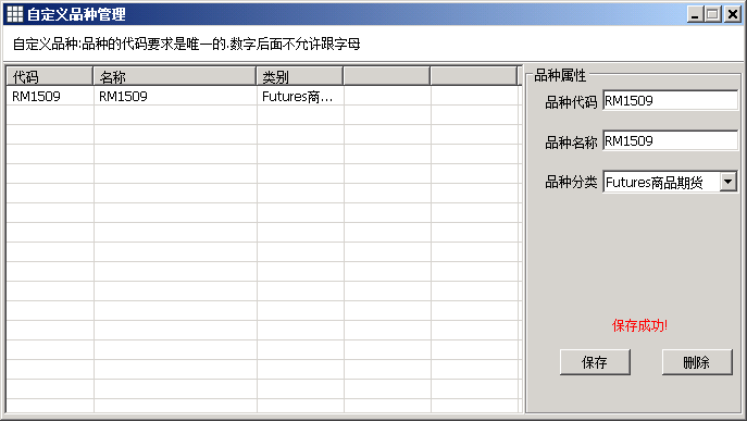 商品期货的品种,默认只显示主力连续品种,比如RM,要使用其他月份合约,比如RM1509等这样的,需要自己添加,使用方法如下: