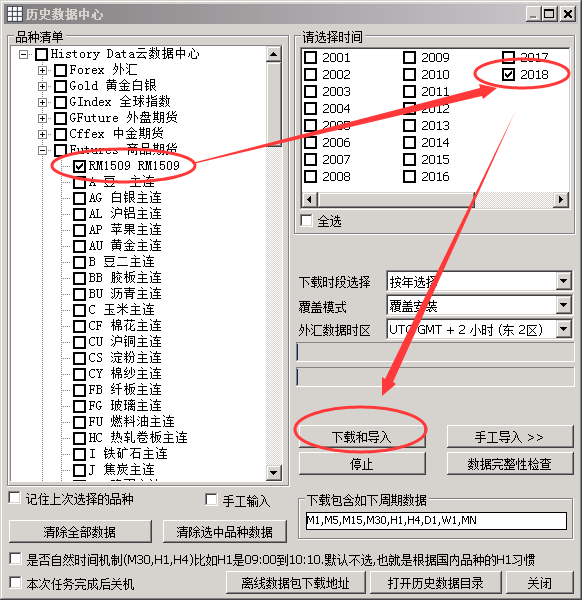 第二步:到历史数据下载中,下载品种RM1509的数据,这个部分的用法,跟其他默认已经存在的品种完全一样.